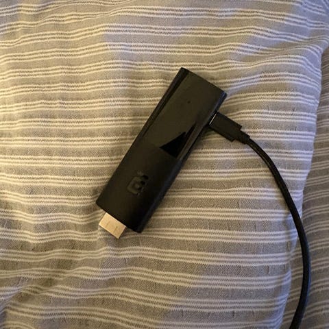 Xiaomi Mi TV Stick med fjernkontroll og tilbehør inkludert strømadapter og USB-kabel. En kompakt mediespiller for streaming av innhold til TV box via HDMI-port.