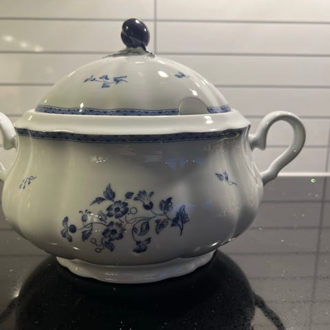Den mellomstore porselensskålen i Blå Herregård-serien er helt perfekt, da den rommer akkurat passe mengde popkorn til filmkvelden.