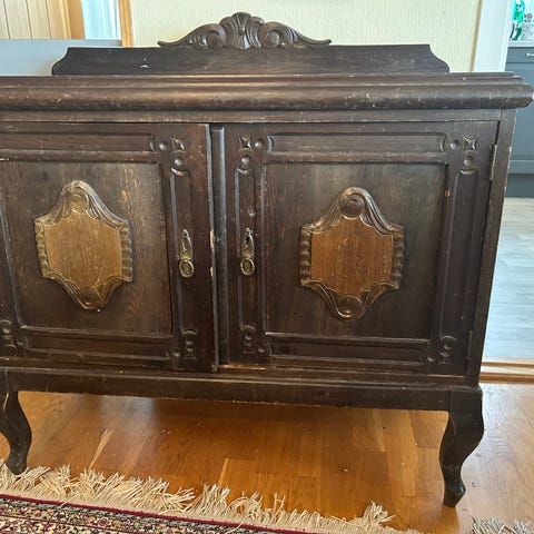 Fin liten antikk skjenk fra 1950-tallet. Opprinnelig ment som radiobord. Nydelige detaljer rundt skuffer.