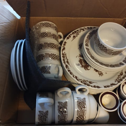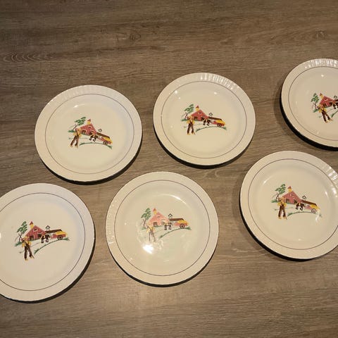 Selger 8 frokosttallerkner / asjetter. En med nag (se bilde).