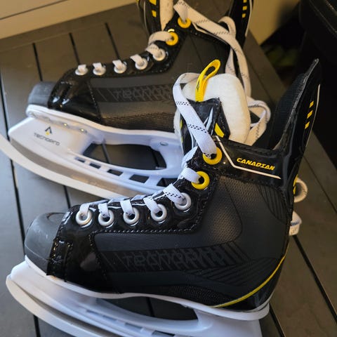 Tecnopro ishockeyskøyter for barn i størrelse 28. Skøytene er designet for ishockey og har hvite lisser og svart/hvitt fargedesign. Egnet for barn som spiller ishockey.