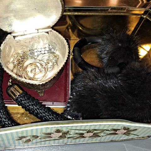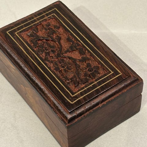 Pent skrin/ smykkeskrin med utskjæringer på lokket Pent inni og ellers men som vist på ene bilde er det flekker på undersiden men ikke betydning for bruken Lengde 21cm bredde 11.5 cm og høyde 4.5 cm ( tykkelse)