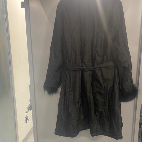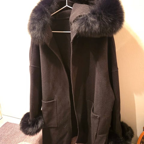 Veldig god og varm brun/grå stoffkåpe med pels inni, kanin?, og minkkrage som kan kneppes av. Pen a-fasong. Str L. Lengde 105 cm. 70 cm over ryggen, ua-ua. Skjult knepping med trekte knapper. Stikklommer på hver side. Oppbrett på ermene. Ermene er vatterte og fôret. Har vært brukt en del, men hel og pen uten feil. Røykfritt hjem, ingen kjæledyr. Kjøpt i Strasbourg for mange år siden. Kr 950.