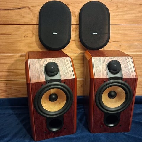 Et par P5 Bower & Wilkins høytalere i pen kirsebærtre-utførelse. Selges billig pga defekte diskanthøytalere. Kan repareres enkelt. Kabler, Tara labs for bi-wiering, følger med.