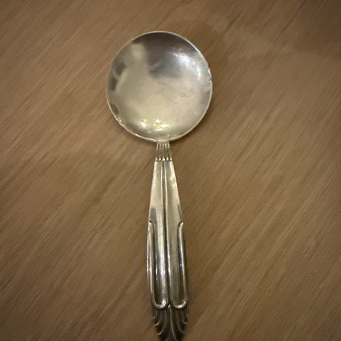 Eldre autentiske deler i god stand med lette bruksspor. Forskjærskniv og stekegaffel er nær ubrukt, men noen småriper på paispadens blad. Skaft i 830S og blader i stål. Se bilder.