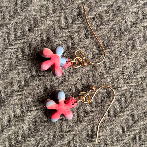 Ganske store øredobber, men lette fordi de er laget av polymerleire, som er et lett og slitesterkt materiale.