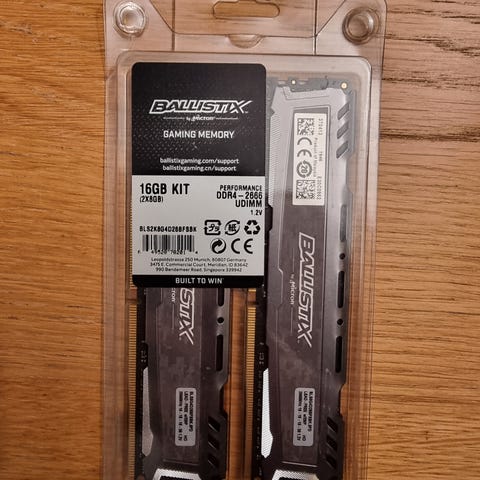 Selger mine Ballistix Sport LT DDR4 16GB RAM brikker, kjøpt nye fra Komplett i 2019 og brukt frem til starten av 2025.