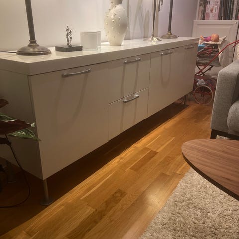 Stor skjenk med fire skuffer og tre skap. Rommer mye. Opprinnelig kirsebær, men er profesjonelt malt/lakkert. Må hentes.