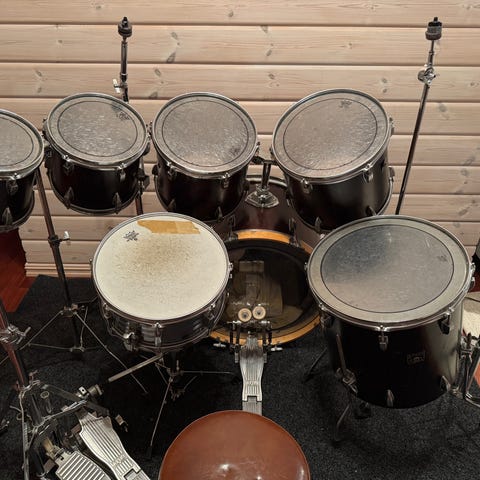 Tama trommesett i rød farge. Settet inkluderer basstromme, skarptromme, og flere tammer. Egnet for musikere som ønsker et komplett trommesett.