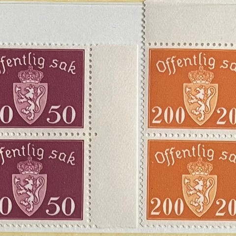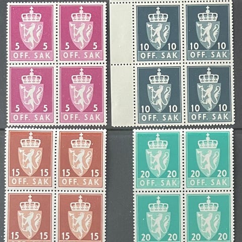 25/20 øre provisorie 1949 og 5 og 10 øre O.S 1951 i fine 4-blokker. Sk= 112 kr