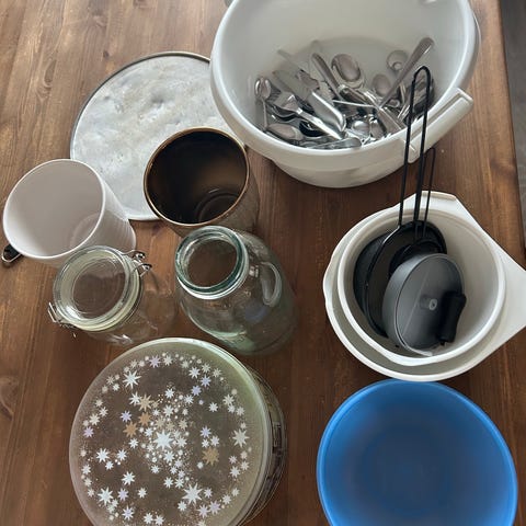 IKEA kjøkkenutstyr og servise bestående av ulike glass, kopper, krukker, tallerkener og bestikk. Produktene har forskjellige materialer og størrelser, egnet for daglig bruk på kjøkkenet.