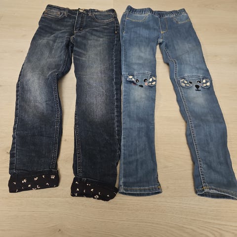 To dongeribukser, en med merkelapp og den andre kun prøvd på. Den ene er merket Lee og den andre SO. Størrelsen tilsvarer cirka 140.