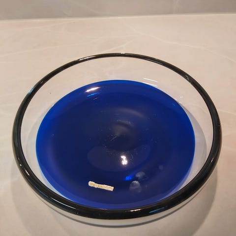 Glassskåler med blå og klar farge. To størrelser er vist, begge med en rund form og blå senter. Skålene er laget av glass og kan brukes til dekorasjon eller servering. Ligner på Hadeland Dråpe, men uten merke på skålene, så det vet jeg ikke sikkert.