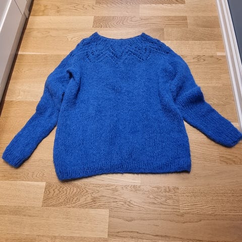 Håndstrikket genser modell Tiril. Str S, overveide 88cm, hel lengde 56 cm, ermelengde 48 cm.