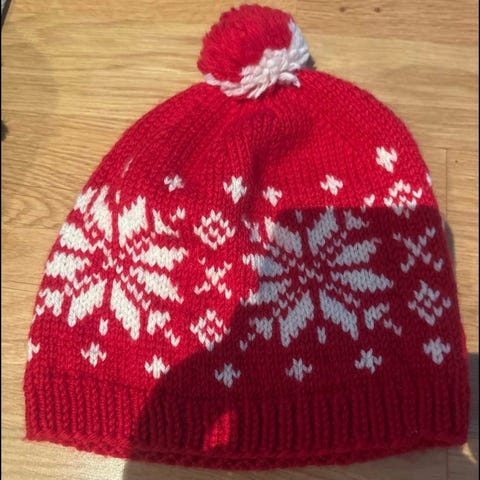 Hjemmestrikket OL 2014 lue uten logo strikket til et større barn. Lite brukt. Litt usikker på materiale den er strikket i men mener bestemt at det ikke er syntetisk men ull el bomull. Se mål og så er den tøyelig 😊