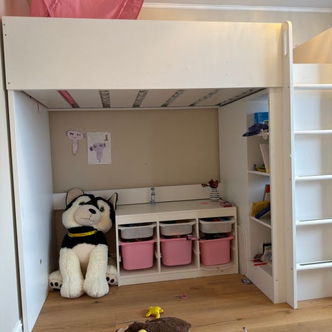 IKEA Loftseng for barn i tre. Enkel konstruksjon med liggeflate på toppen og plass under sengen til oppbevaring eller lek.