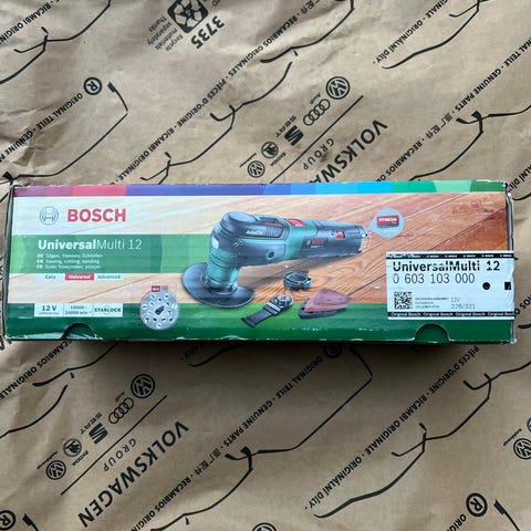 Bosch Professional 12V multiverktøy. Inkluderer 6 batteri og 3 lader. Verktøyene har ergonomisk grep og røde betjeningsknapper, og er laget for bruk med 12V batterier.