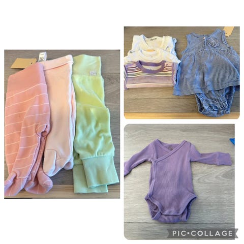Kjole fra H&M 5% ull. Sett fra voksi 80% ull, 20% silke. Sett fra janus med bukse og genser, 100% merinoull. Har flekker av kulepenn. Body fra Cubus 100% merinoull. Har misfarging ved hals.