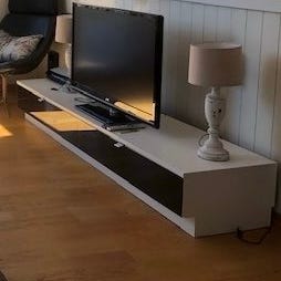 2 stk 120 cm benker til en svært rimelig pris. På toppen 2 hvite glassplater som gir et pent brudd i det mørke treverket. Lys på baksiden følger med. Disse må hentes.