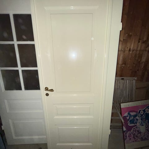 Dørhåndtak med nøkkelskilt i messing og hvit tre