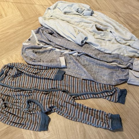 Pysj i ull med silke. Pysjen har hull på knærne, men hvis noen ønsker å sette på lapper på, er det mye bruk igjen.