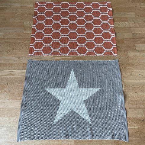 Teppet kan vendes på begge sider og brukes både inne og ute. Dette teppet er kun brukt inne.