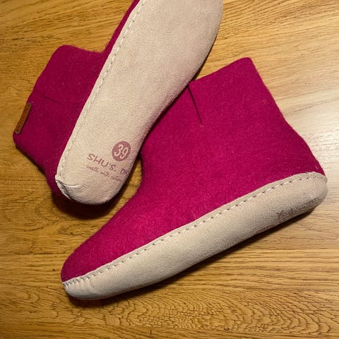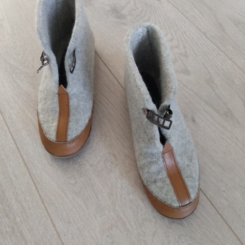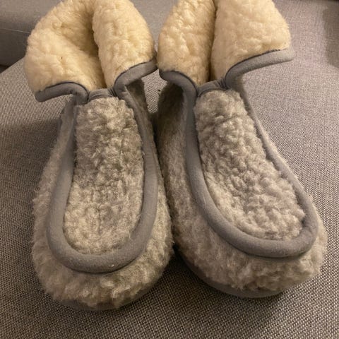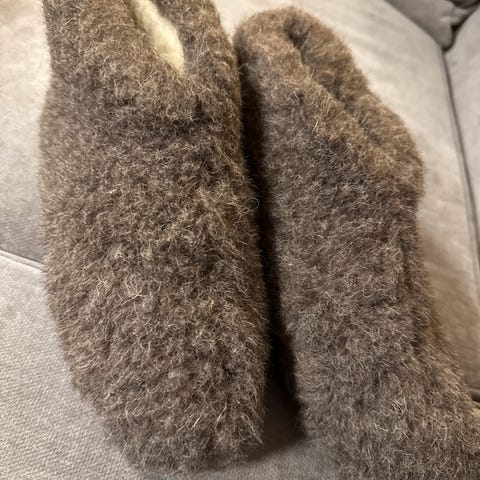 Selger noen helt nye og ubrukte tøfler fra Mjuk. Semsket skinn utenpå, tykk saueull inni. Str 40/41.