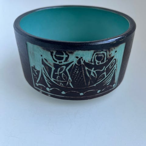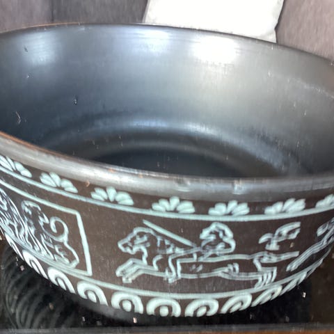 Rörgild keramisk skål med modellnummer 212. Skålen har dekorative mønstre på utsiden og en mørk innside. Laget i Danmark.