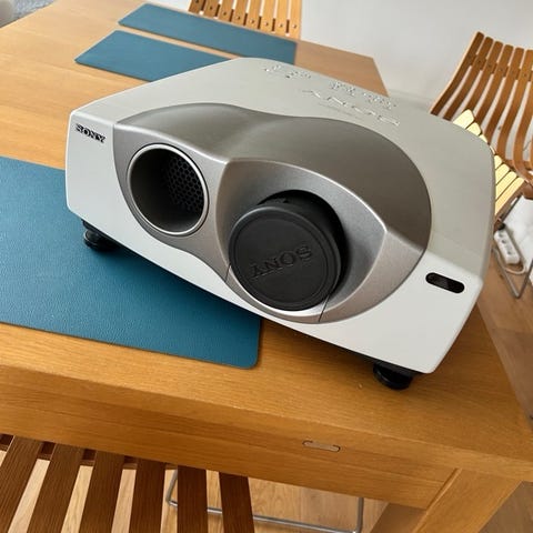 Sony projektor med flere tilkoblingsmuligheter. Produktet er hvitt og har en kompakt design. Egnet for visning av bilder og video i ulike miljøer.