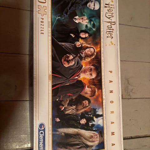 Harry Potter Panoramapuslespill med 1000 brikker. Puslespillet har et panoramabildedesign med motiver fra Harry Potter-serien. Kun brukt 1 gang. Alle brikker er der.
