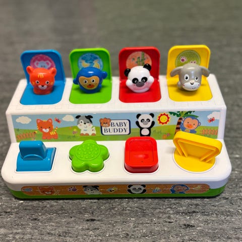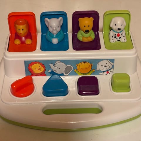 Fisher-Price Pop-Up Benk barneleke med fargerike knapper og figurer som popper opp. Designet for små barn for å stimulere motoriske ferdigheter og tidlig læring.