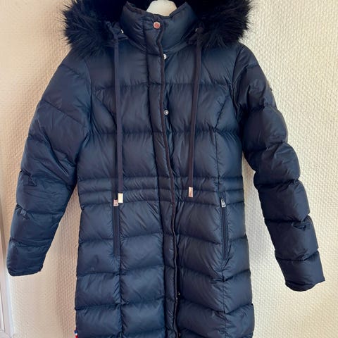 Lang og romslig dunkåpe i flott rødfarge. Kåpen er str. XS, men stor i størrelsen og har blitt for romslig for meg. Brukt i ca. 2 år og pent behandlet – ingen hull eller flekker.