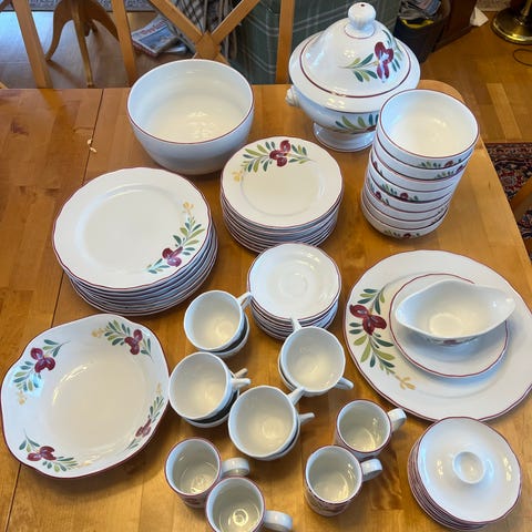 Komplett middags- og kaffeservise fra Firkløveren i serien Madeleine, til 12 personer. Serviset er ikke brukt, og ligger pakket i originaleske. Serviset kan vaskes i oppvaskmaskin og tåler mikrobølgeovn. Det følger også med bestikk til 12 stk, samt serveringsfat og serveringsbestikk. Duk følger også med.