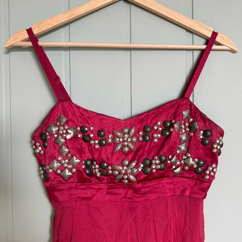 Veldig flott ballkjole i rød farge med flere fine detaljer. Perler sydd på flere steder i front, på brystet og stroppene. To store blomster foran og en sløyfe bak. Kjolen er rød, men med noen striper i stoffet. Stor splitt på den ene siden som er fylt med stoff. Følger med et sjal.