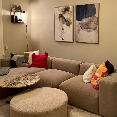 Kombinasjon: Low armrest right med sjeselong og åpen ende venstre side. Det følger også med en Mags Cushion (pute) i samme stoff som sofaen.