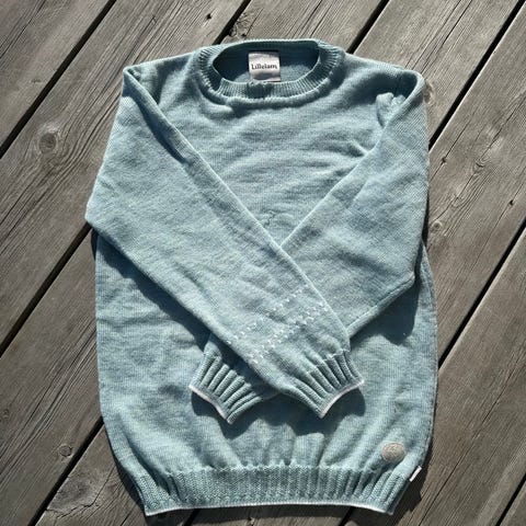 Ny merinoullgenser fra Lillelam i str 116. Lappen henger på- den ble glemt i skapet.