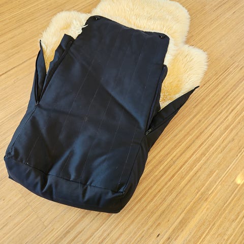 Utrolig varm og god vognpose i saueskinn, med en elegant utside i blå cordfløyel.