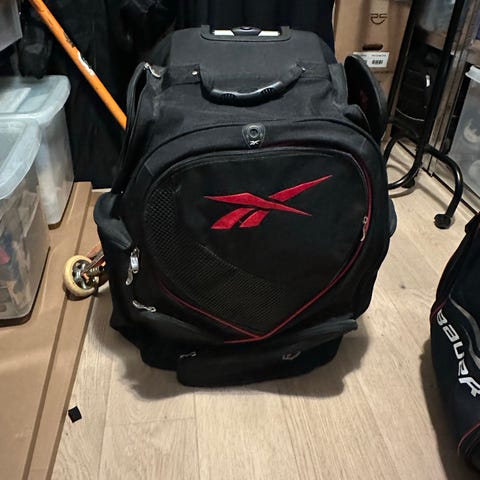 Frisk Ishockey bag med hjul i grønn og rød farge. Baggen er designet for skøytesport, spesielt ishockey, og har bærestropper samt hjul for enkel transport.