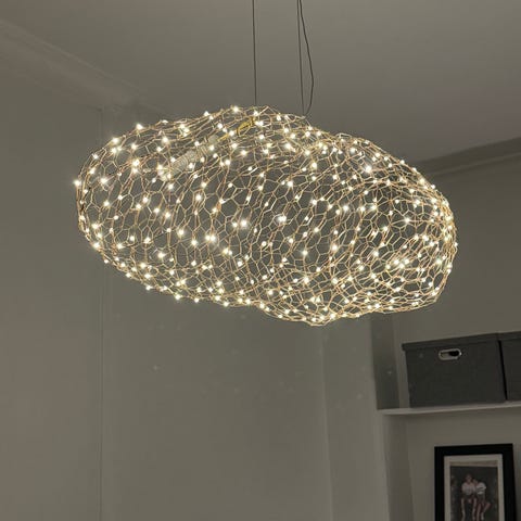 Hayden LED-taklampe i gull er en stilig og moderne løsning for ditt hjem. Denne elegante lampen med den organiske formen er ikke bare en lyskilde, men også et dekorativt element som kan heve ethvert rom. Med sin unike design, som minner om en svevende sky av små LED-lys, skaper den en magisk atmosfære når den lyser opp.