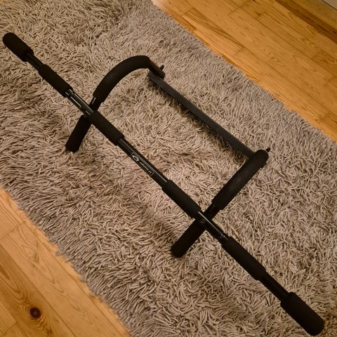 Dørgym selges da dørene våre ikke er egnet. Henges i døråpningen uten fester, og kan enkelt settes i og tas ut.