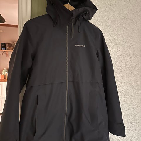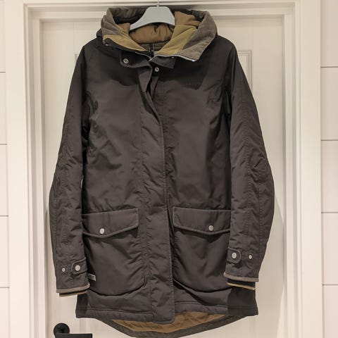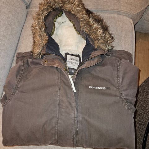 Didrikson parkas i størrelse 40. Jakken har olivengrønn farge og et sennepsgult tykt for. Pent brukt, og har lite slitasje. Se bilde nr. 2 fra nett, det viser fargen på jakken bedre. Flere innvendige lommer og en god hette som er avtagbar.