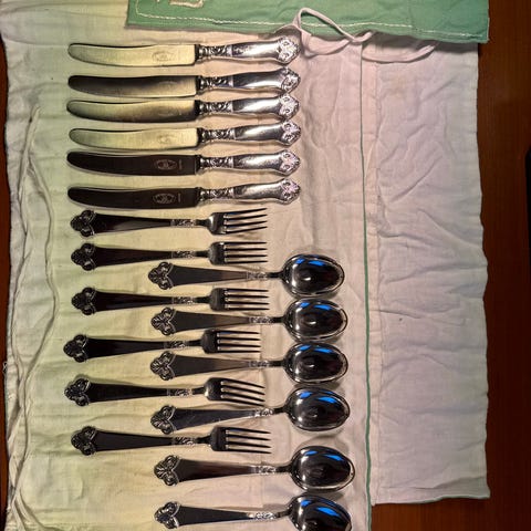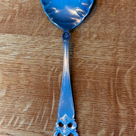 3 stk Norrøna sølvplett skje selges. Alle merket 60 gr DA. 15 cm lang.