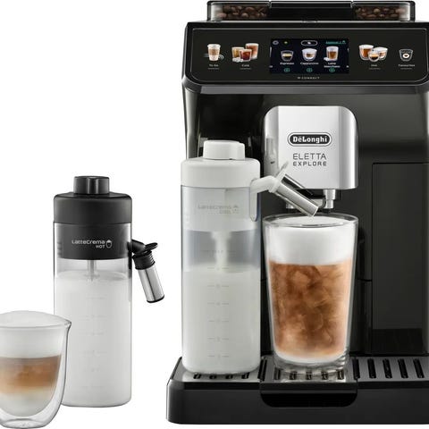 Nespresso kaffemaskin med melkeskummer i hvit farge. Maskinen har et kompakt design og inkluderer en integrert melkeskummer for tilberedning av kaffedrikker med melk.