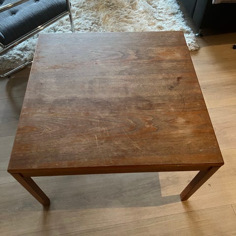 Stort teak salongbord / sofabord med lekre ben. Pent brukt, lite skader, men trenger vask/puss/oljing.
