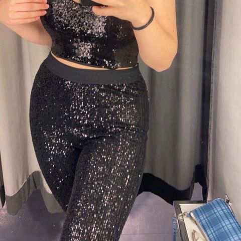 Vid bukse med paljetter i sølv. Strikk i livet, så den er utrolig behagelig å ha på.