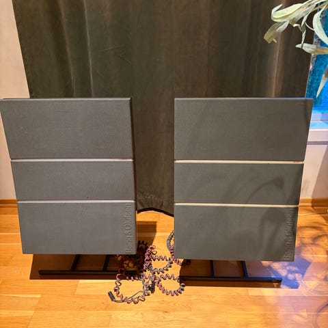Klassiske Bang & Olufsen høyttalere produsert i Danmark. Slanke panelhøyttalere som egner seg godt for veggmontering. Spiller balansert og behagelig, typisk B&O-lyd.