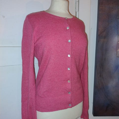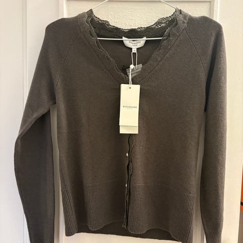 Myk og behagelig mørk grå cardigan i 100% cashmere fra Rosemunde. Fine hvite perleknapper. Lite og pent brukt. Str L og vil si den er vanlig i str, men kan evt brukes av M også.