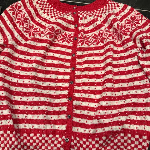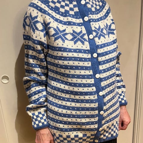 Nystrikket Fanakofte strikket i marinoull Woolevo. Str. L. Mål: Brystvidde: 110 cm, Lengde 75 cm, Ermlengde: 45 cm