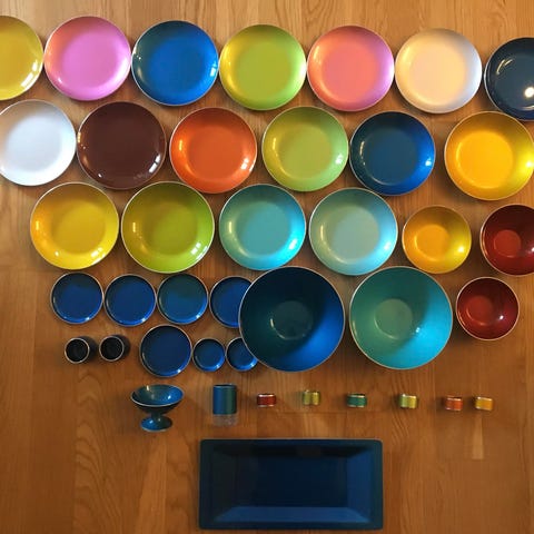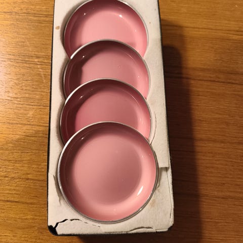 Emaljerte dessertskåler eller små stettefat. To gule og to grønne. 14 cm i diameter, 9 cm høye. Svært lite brukt, men noen små overflateriper. Et lite slag på den en gule. Se bilde. Synlige merker etter klistrelapper fra Emalox.