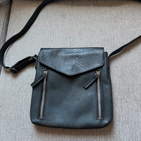 Pen stoffveske kun brukt en gang. I tillegg til et lite utvendig rom, så har den to separate rom som lukkes med glidelås. Vesken er 22 cm bred og 16 cm dyp.